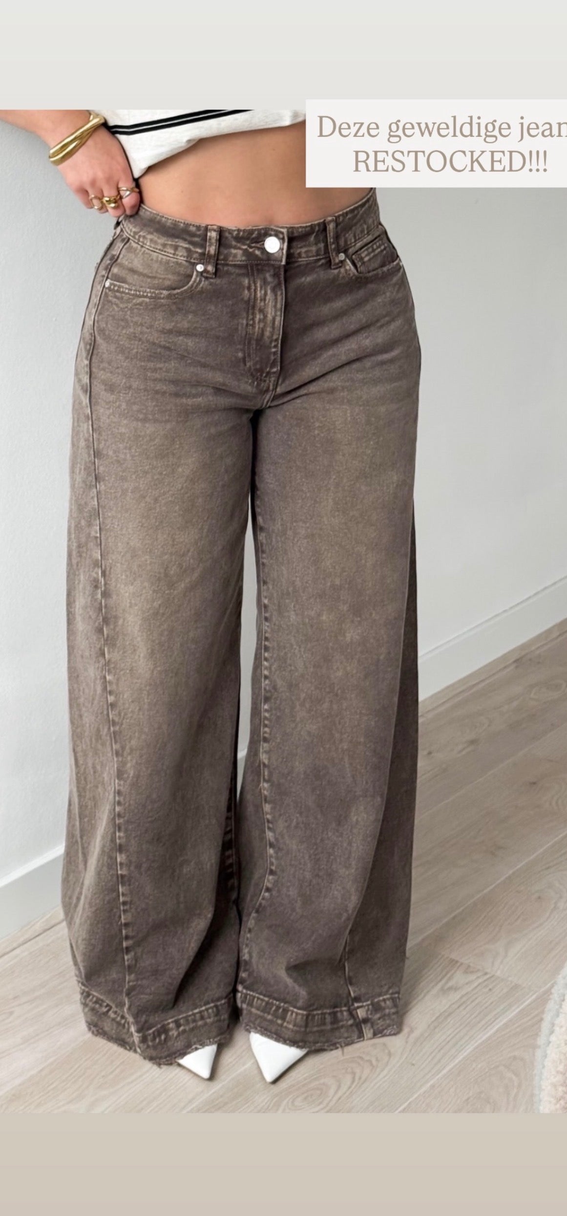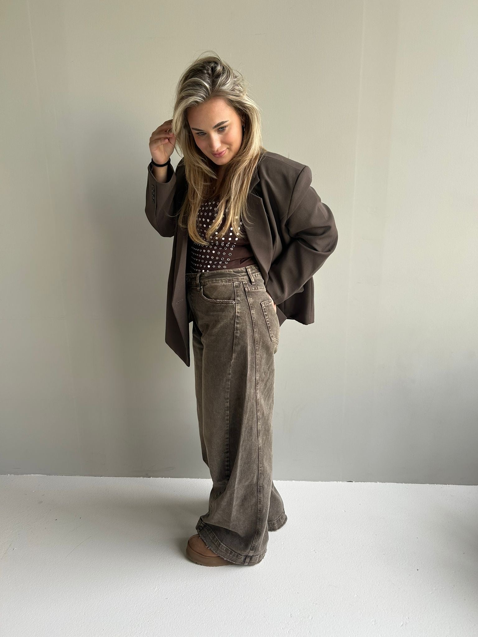 Deze bruine jeans is een highwaist en valt mooi op maat . Heeft minimaal stretch erin .